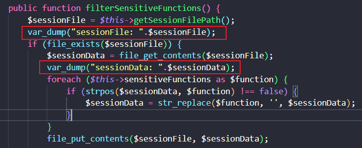 1 2 3 4 5 6 7 private $sensitiveFunctions = ['system', 'eval', 'exec', 'passthru', 'shell_exec', 'popen', 'proc_open']; .... foreach ($this->sensitiveFunctions as $function) { if (strpos($sessionData, $function) !== false) { $sessionData = str_replace($function, '', $sessionData); } }