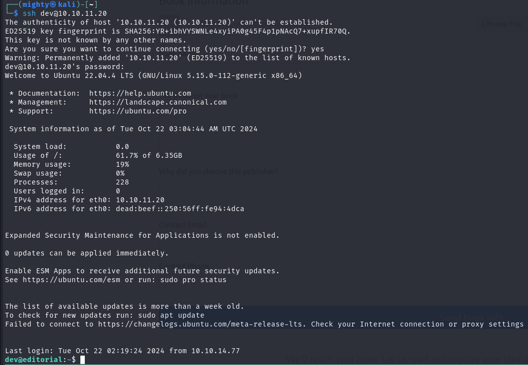 ┌──(mighty㉿kali)-[~] └─$ sudo nmap -sV -Pn -A -p22,80 10.10.11.20 PORT STATE SERVICE VERSION 22/tcp open ssh OpenSSH 8.9p1 Ubuntu 3ubuntu0.7 (Ubuntu Linux; protocol 2.0) | ssh-hostkey: | 256 0d:ed:b2:9c:e2:53:fb:d4:c8:c1:19:6e:75:80:d8:64 (ECDSA) |_ 256 0f:b9:a7:51:0e:00:d5:7b:5b:7c:5f:bf:2b:ed:53:a0 (ED25519) 80/tcp open http nginx 1.18.0 (Ubuntu) |_http-server-header: nginx/1.18.0 (Ubuntu) |_http-title: Did not follow redirect to http://editorial.htb