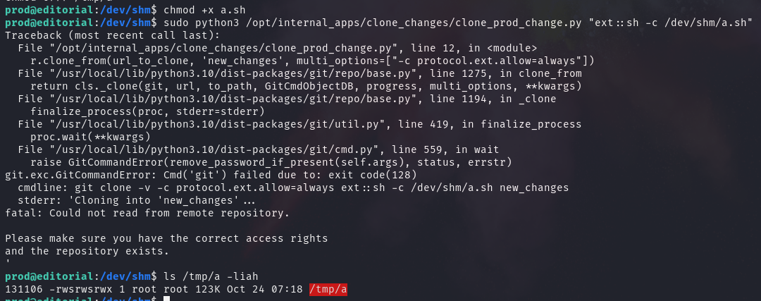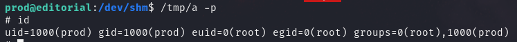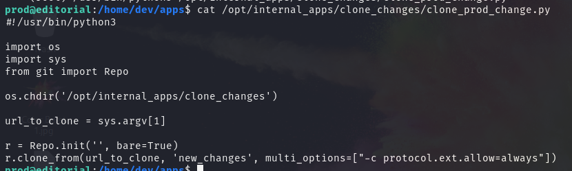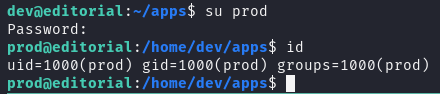 dev@editorial:~$ cd /home dev@editorial:/home$ ls dev prod dev@editorial:/home$ ls -liah total 16K 76438 drwxr-xr-x 4 root root 4.0K Jun 5 14:36 . 2 drwxr-xr-x 18 root root 4.0K Jun 5 14:54 .. 79764 drwxr-x--- 4 dev dev 4.0K Oct 22 06:52 dev 77643 drwxr-x--- 5 prod prod 4.0K Jun 5 14:36 prod