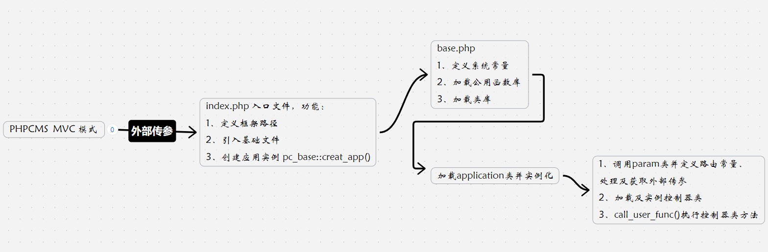 | public function __construct() { $this->init(); } //调用 init() =>private function init() { $controller = $this->load_controller(); // 加载控制器 if (method_exists($controller, ROUTE_A)) { if (preg_match('/^[_]/i', ROUTE_A)) { exit('You are visiting the action is to protect the private action'); } else { call_user_func(array($controller, ROUTE_A)); // ROUTE_A 即传参 a,执行实例化对象内部类方法 } } else { exit('Action does not exist.'); } } =>private function load_controller($filename = '', $m = '') { if (empty($filename)) $filename = ROUTE_C; if (empty($m)) $m = ROUTE_M; $filepath = PC_PATH.'modules'.DIRECTORY_SEPARATOR.$m.DIRECTORY_SEPARATOR.$filename.'.php'; if (file_exists($filepath)) { $classname = $filename; include $filepath; // 包含指定控制器 if ($mypath = pc_base::my_path($filepath)) { $classname = 'MY_'.$filename; include $mypath; } return new $classname; //实例控制器,执行构造函数并返回实例化对象 } else { exit('Controller does not exist.'); } }