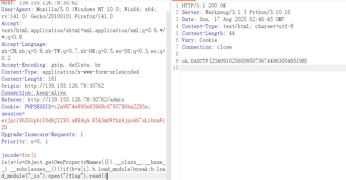1 2 3 4 5 6 7 8 9 10 11 12 13 14 15 16 @app.route('/admin', methods=['GET', 'POST']) def admin(): if session.get('is_admin'): if request.method == 'POST': js = request.form['jscode'] if len(js) >155: return "too long" try: result=js2py.eval_js(js) return f"ok,{result}" except Exception as e: return f"An error occurred: {str(e)}" else: return render_template('admin.html') else: return redirect(url_for('login'))