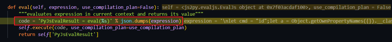 分析 这 poc 拿来也看不懂如何实现的,先顺一顺逻辑 js2py/evaljs.py::eval() 将传入的 payload 再套一层 PyJsEvalResult = eval(%s)