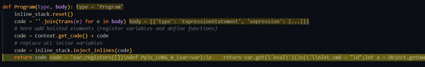 题目最上面定义了 pyjsparser.parser.ENABLE_PYIMPORT = False ,这阻止了显式pyimport语句,不能在用它导入模块 此时在回到最开始的 poc,看看 Marven11 师傅这条利用链是如何实现绕过的