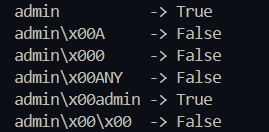 bcrypt 的已知特性,72 字节截断,超过 72 字节的输入会被忽略,但这不帮助弄到和 b"admin" 相等的哈希;NUL 截断,空字节注入是有可能,我对其进行测试