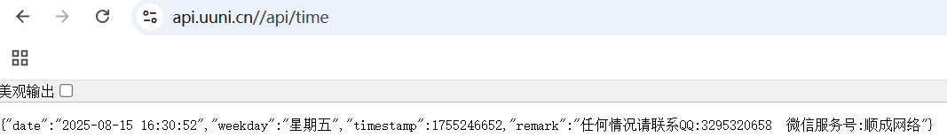 1 2 # {"date":"2080-08-15 16:30:52","weekday":"星期五","timestamp":1755246652,"remark":"任何情况请联系QQ:3295320658  微信服务号:顺成网络"} python3 -m http.server 29999