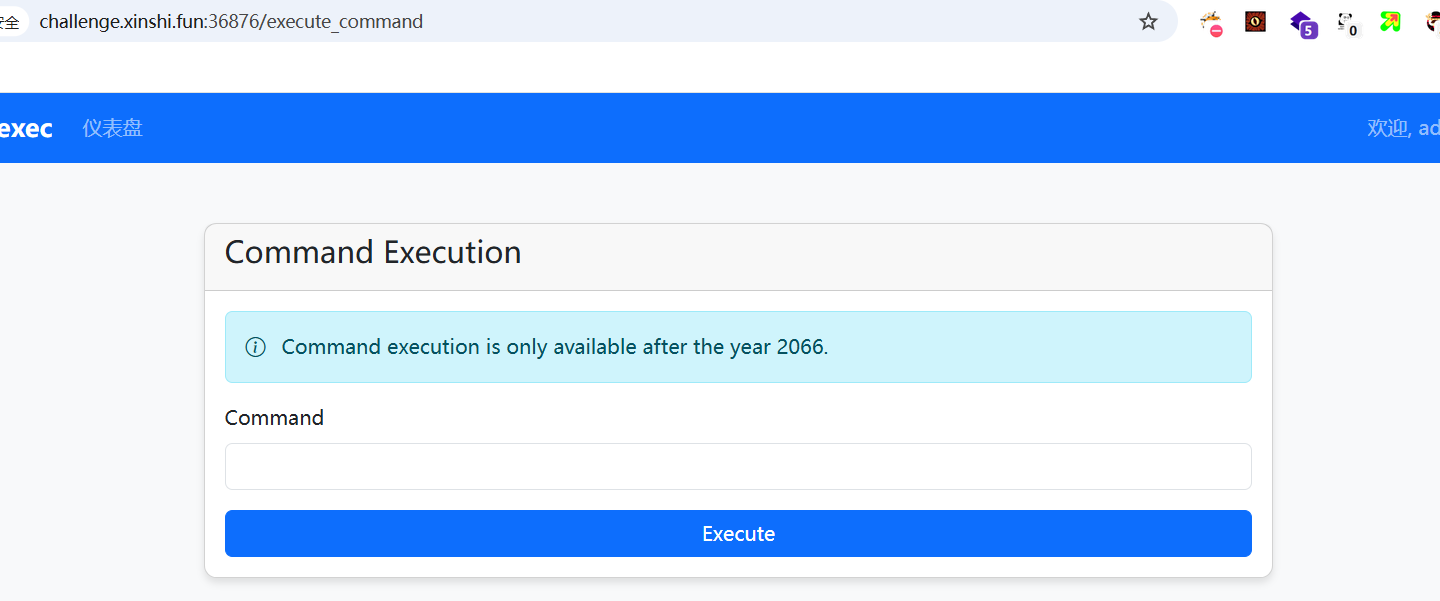 1 2 3 4 5 6 7 8 9 10 11 12 13 14 15 16 17 18 19 20 21 22 23 24 25 @app.route('/execute_command', methods=['GET', 'POST']) @login_required def execute_command():     result = check_time_api() 		  => 			def check_time_api(): 			    user = User.query.get(session['user_id']) 			    try: 			        response = requests.get(user.time_api) 			        data = response.json() 			        datetime_str = data.get('date') 			        if datetime_str: 			            print(datetime_str) 			            current_time = datetime.fromisoformat(datetime_str) 			            return current_time.year >= 2066 			    except Exception as e: 			        return None 			    return None     if result is None:     if not result:     if request.method == 'POST':         os.system(command)         ...     return render_template('execute_command.html')