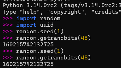 先看一下 uuid8 方法怎么实现的。random.getrandbits() 生成,这里用的是 random 模块的 PRNG,会被 random.seed() 全局播种影响;随后进行位拼装得到字符串