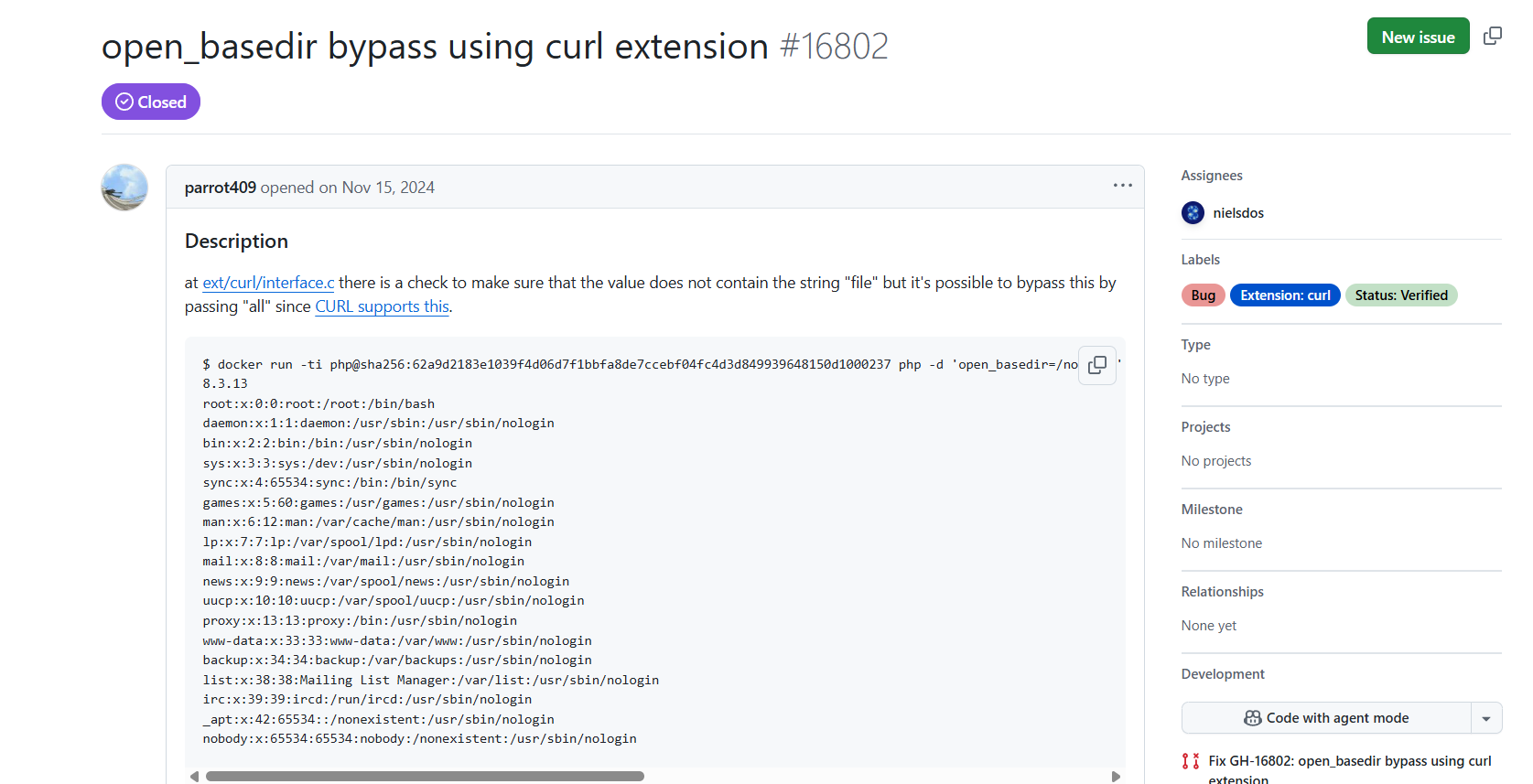 在正常情况下,curl 的 file:// 协议是受到 open_basedir 限制的,这意味着如果 open_basedir 被设置为限制访问的路径,file:// 协议会被阻止。curl 扩展允许通过 CURLOPT_PROTOCOLS_STR 选项来显式指定允许使用的协议,并将其设置为 all。这意味着可以让 curl 支持所有协议,包括 file:// 协议,即使该协议在 PHP 配置中通常会受到限制。
