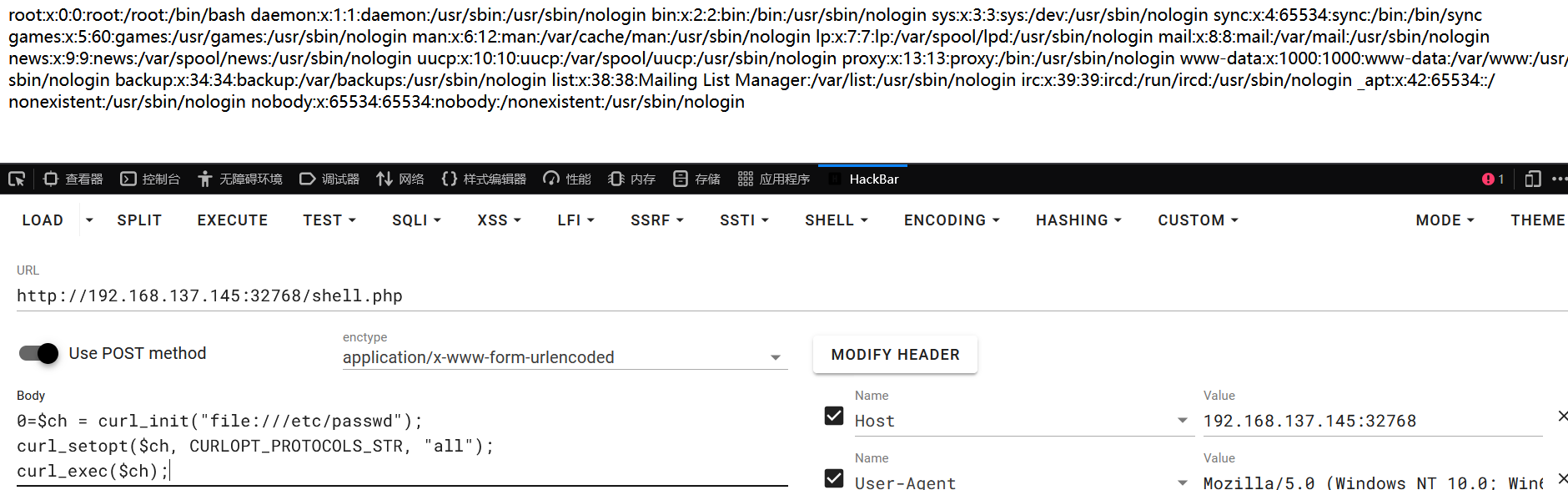 1 2 3 $ch = curl_init("file:///etc/passwd"); curl_setopt($ch, CURLOPT_PROTOCOLS_STR, "all"); curl_exec($ch);